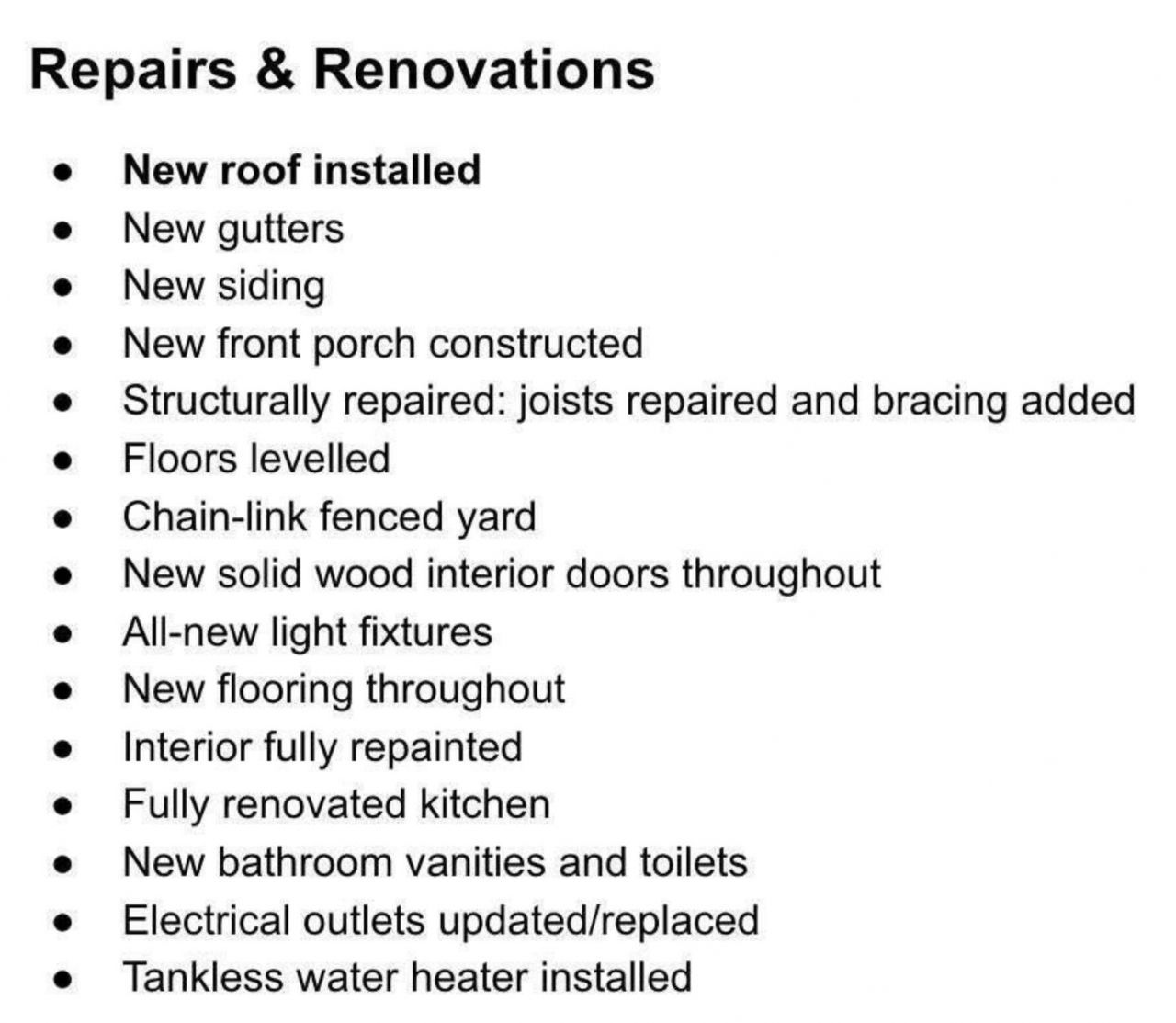 Fully renovated MOVE IN READY one-level home with extensive structural and cosmetic updates throughout. Recent exterior improvements include a new roof, gutters, updated siding, and a newly built front porch that adds strong curb appeal. The yard is fully fenced with chain-link for a secure outdoor space.Major structural work has already been completed, including repaired joists, added bracing, and professionally levelled floors. Inside, the home features solid wood interior doors, new flooring throughout, updated lighting, fresh paint, and updated electrical outlets. The kitchen has been completely renovated, and both bathrooms include new vanities and toilets. A tankless water heater provides efficient on-demand hot water. New stove to be installed soon. A thoroughly updated, move-in-ready home offering comfortable one-level living in a convenient Chattanooga location.